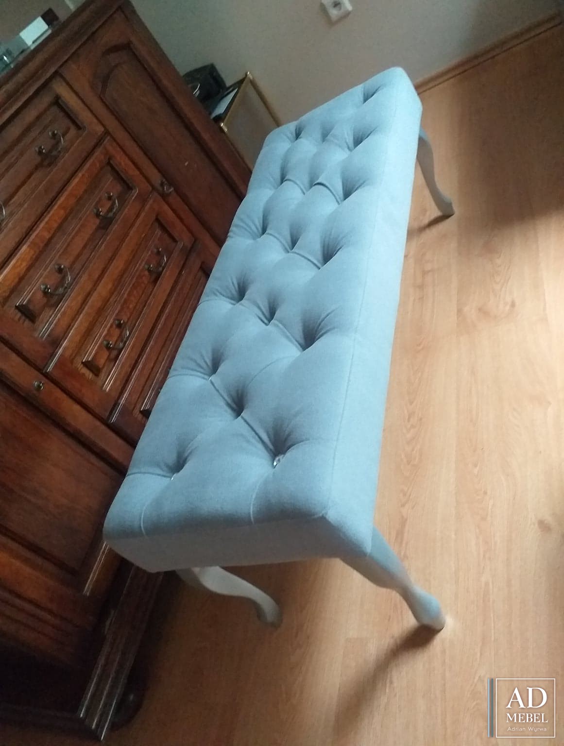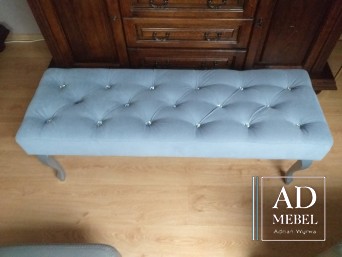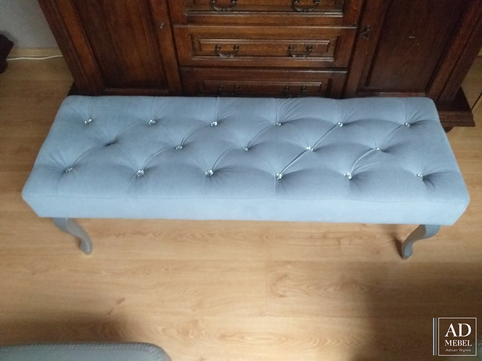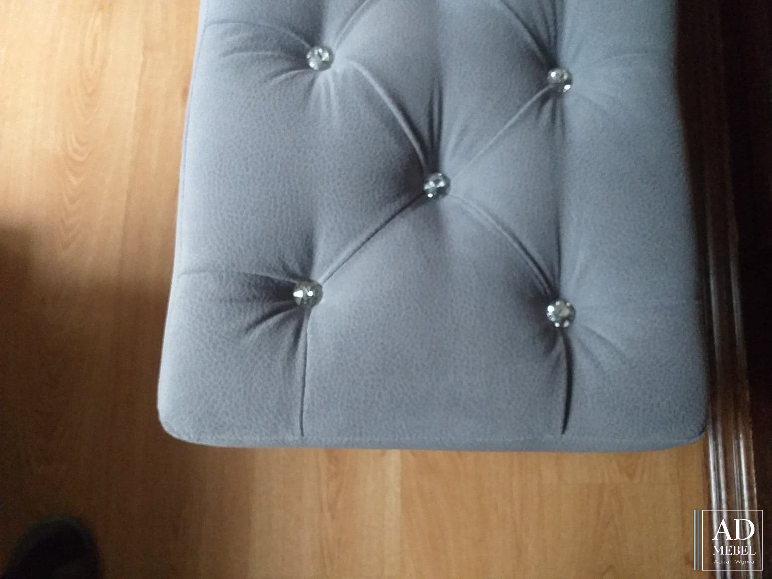 Duża pikowana pufa. Możliwość zmiany wykończenia koloru tapicerowanego. Zastosowanie guzików-kryształków.