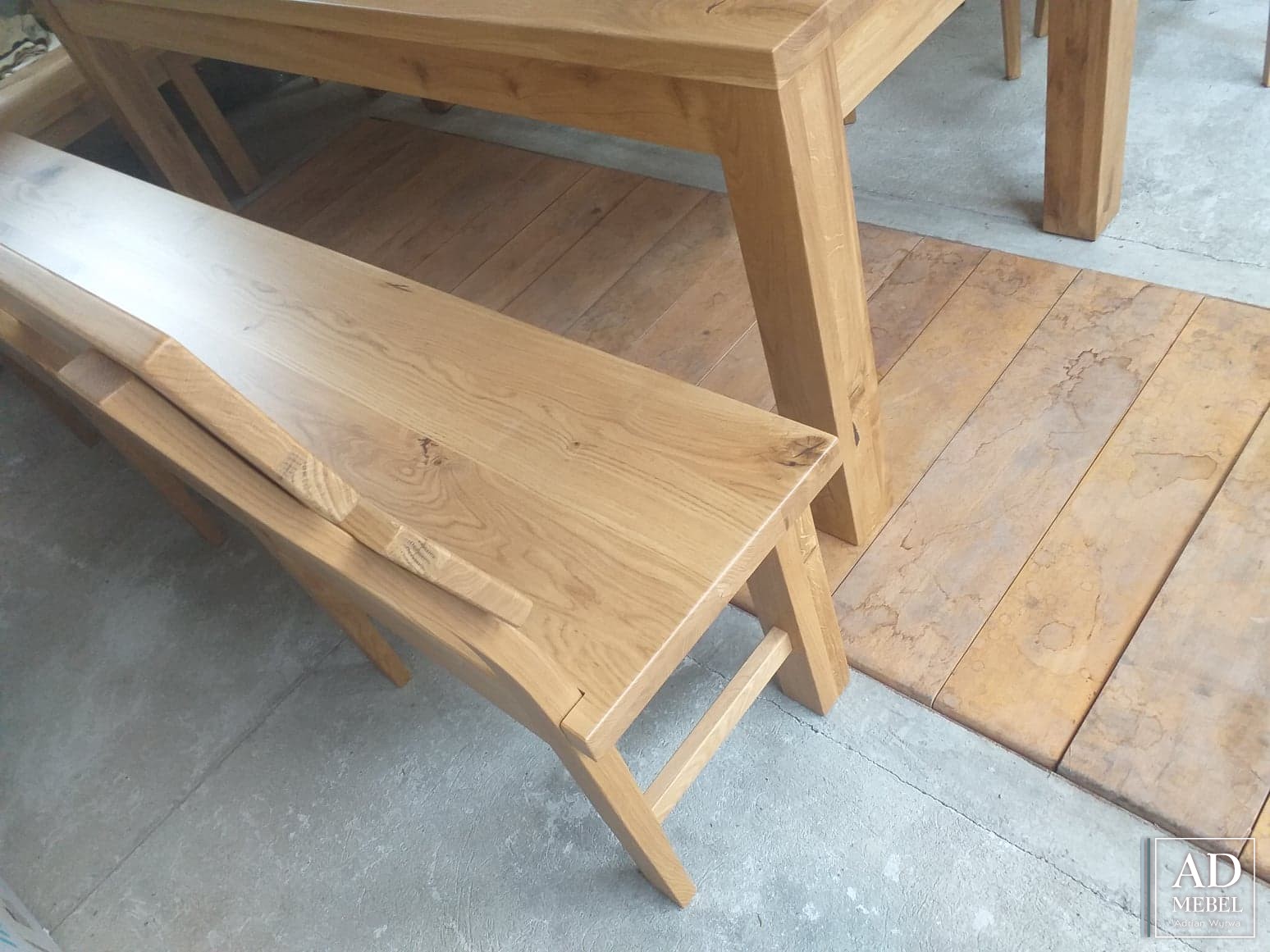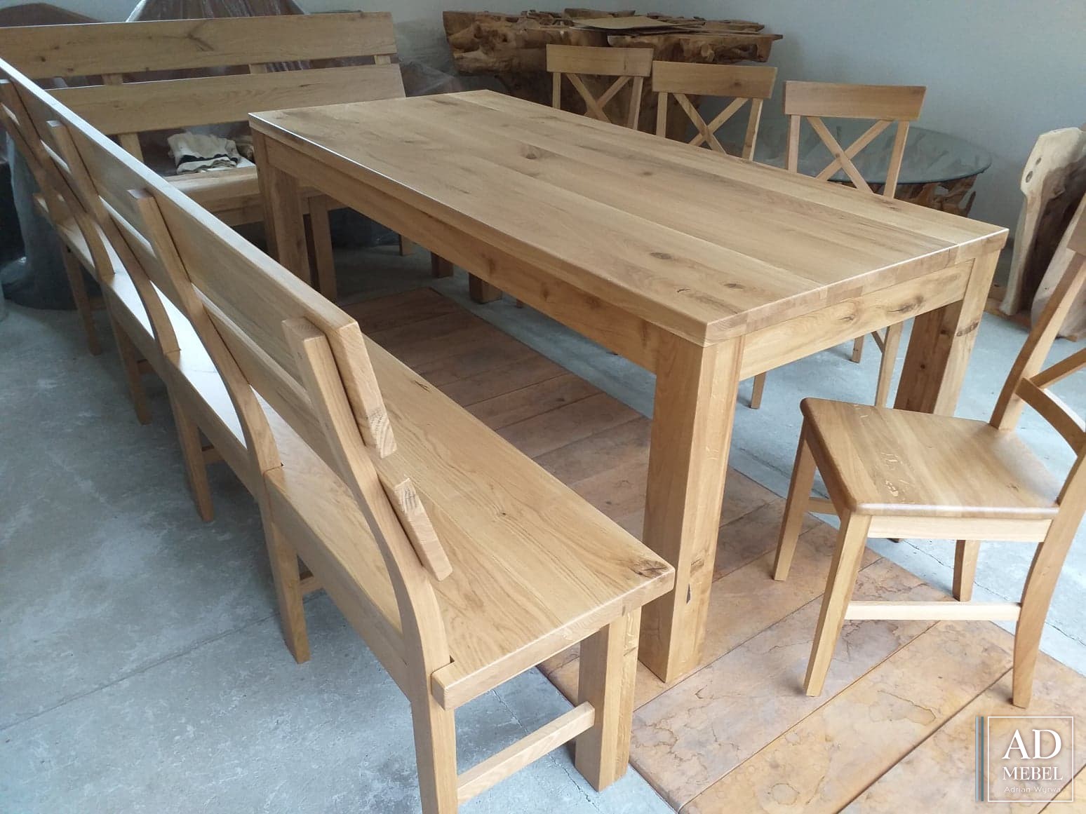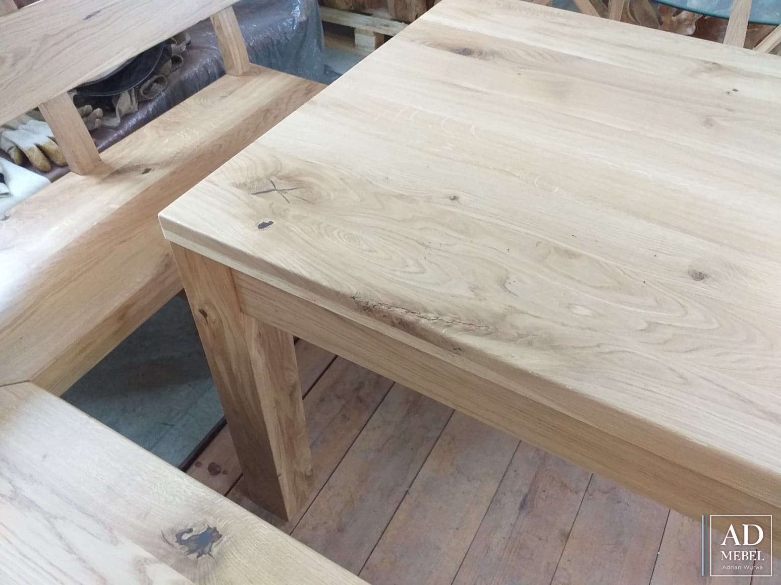 Stół wykonany z litego drewna dębowego w ciekawej, rustykalnej estetyce. Naturalne ubytki drewna wypełnione na życzenie Klienta wysokiej jakości kitem do drewna. Całość pokryta lakierem poliuretanowym.