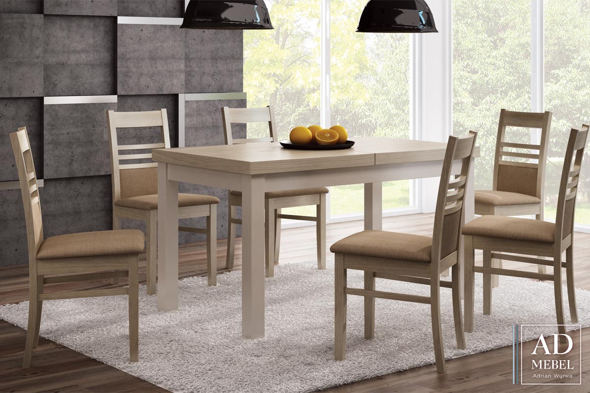 Blat wykonany został z okleiny naturalnej (do wyboru bukowa lub dębowa). Nogi z litego drewna bukowego. Mocna konstrukcja zapewnia bardzo solidną stabilność stołu.