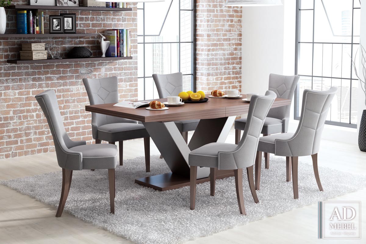 Blat stołu wykonany z naturalnej okleiny (w ofercie dębowa lub bukowa). Obrzeże stołu w trapezowym kształcie (możliwość zmiany kształtu obrzeża na prostokątne). Podstawa stołu wykonana ze stali nierdzewnej szczotkowanej, wykończonej lakierem półpołyskowym poliuretanowym.