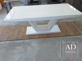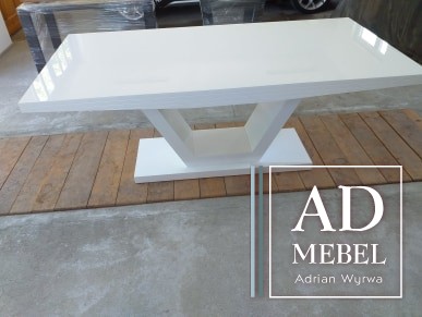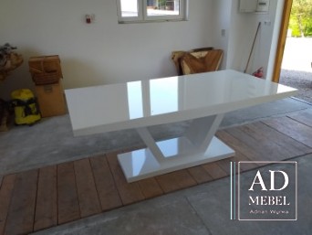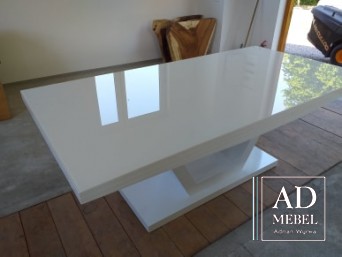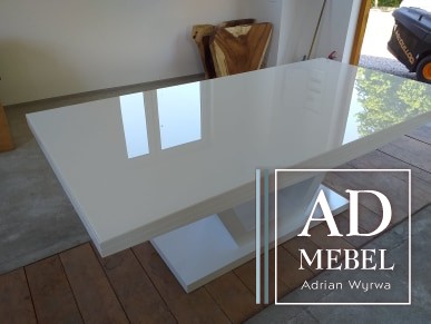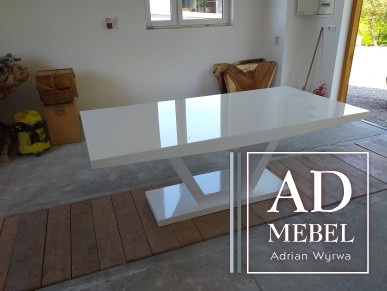 Stół wykonany z połączenia litego drewna oraz okleiny naturalnej w dowolnym, wybranym przez Klienta wybarwieniu. Na fotografii stół wykończony w połysku. Blat pokryty taflą szkła.