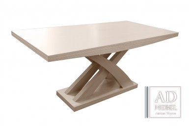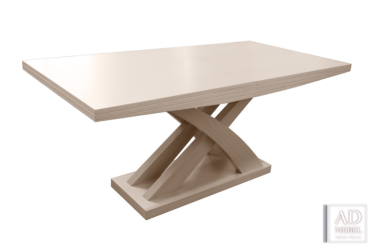 Blat o trapezowym kształcie oraz podstawa stołu wykonane z okleiny naturalnej. Mocna konstrukcja zapewnia bardzo solidną stabilność stołu. Możliwość rozłożenia stołu dzięki metalowej prowadnicy, na której można umieścić wkład.