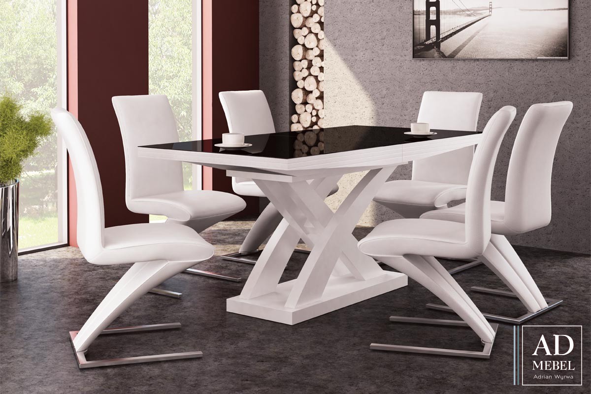 Blat, przykryty hartowaną szybą dowolnego koloru, o trapezowym kształcie oraz podstawa stołu wykonane zostały z okleiny naturalnej. Mocna konstrukcja zapewnia bardzo solidną stabilność stołu. Stół posiada funkcjonalność rozłożenia go dzięki metalowej prowadnicy, na której umieszcza się wkład.