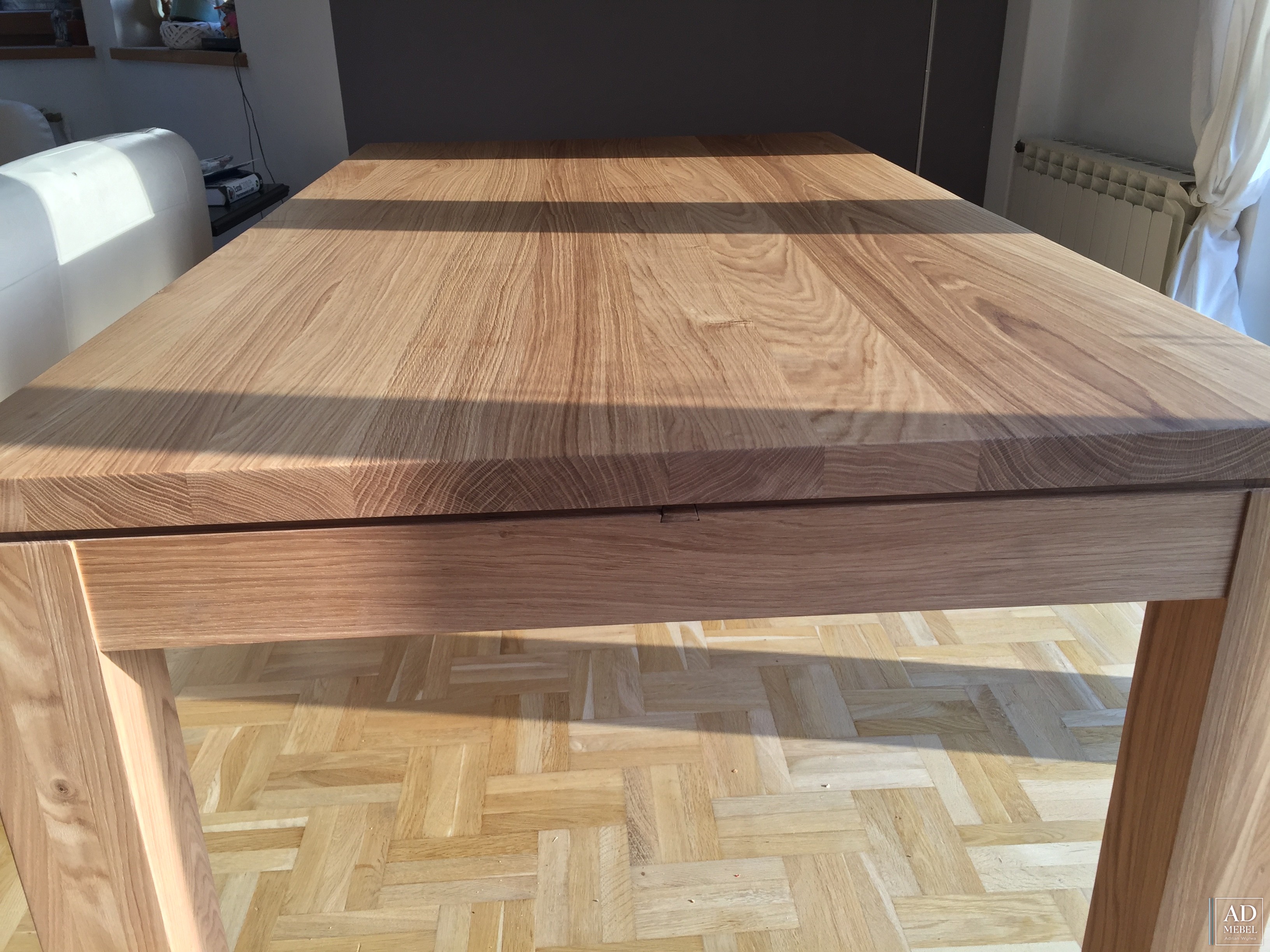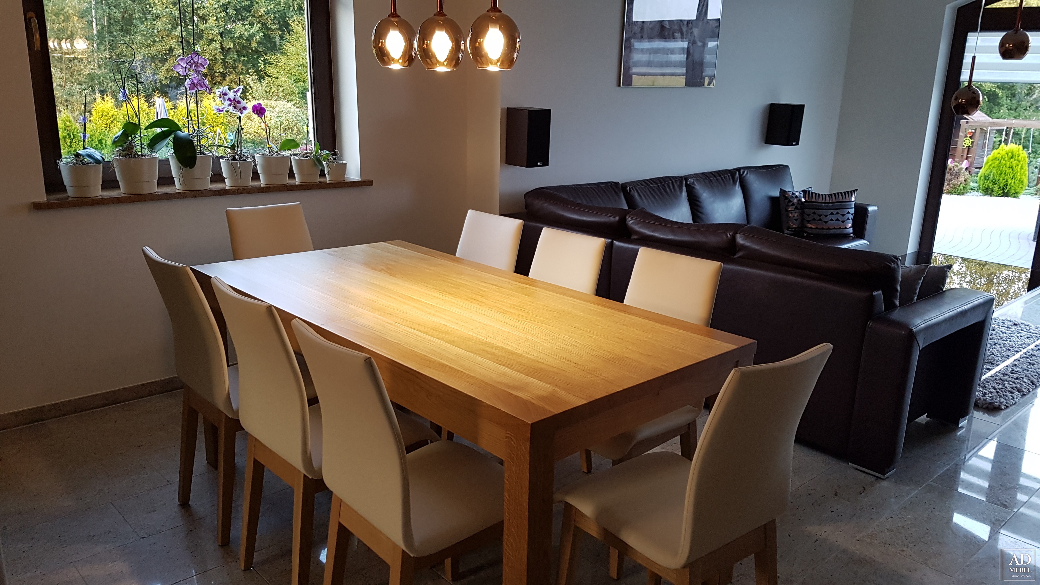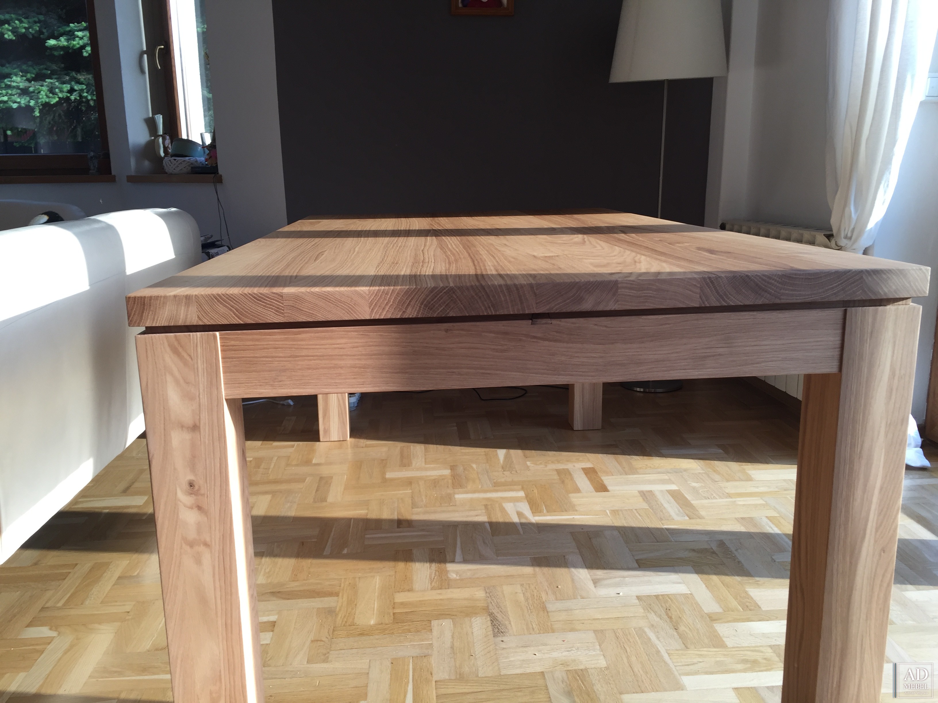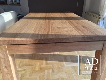 Stół wykonany w stu procentach z litego drewna dębowego: nogi (10cm x10cm), blat o grubości 4cm oraz oskrzynia (10cm x 4cm). Automatyczny rozsuw. Stół wykończony w pełnym macie lakierem poliuretanowym.