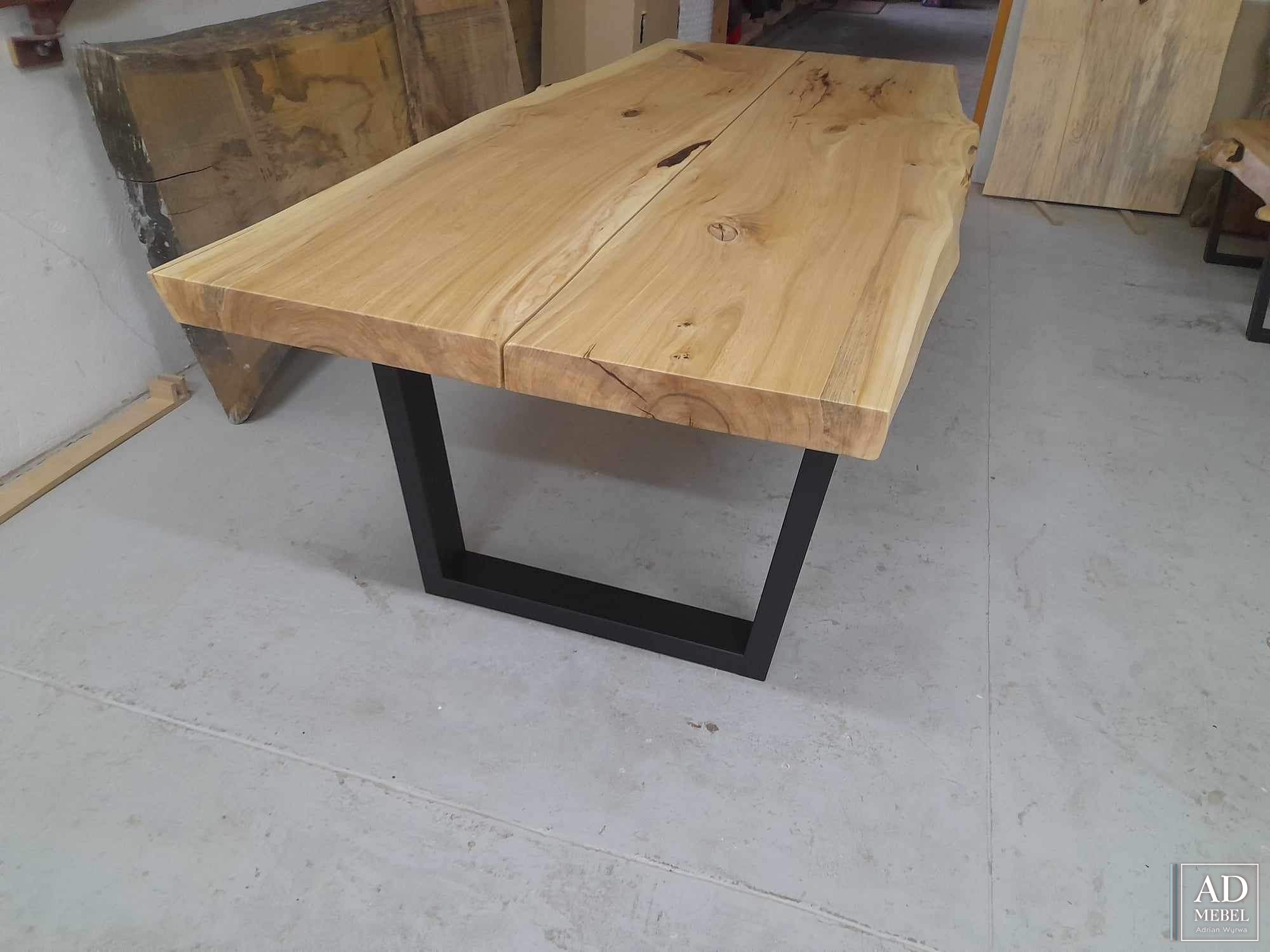 Stół wykonany z połączenia drewna wiązowego, żywicy epoksydowej, wysokiej jakości olejowosków oraz czarnej stali malowanej proszkowo. Dostępny do kupienia. Zapraszamy.