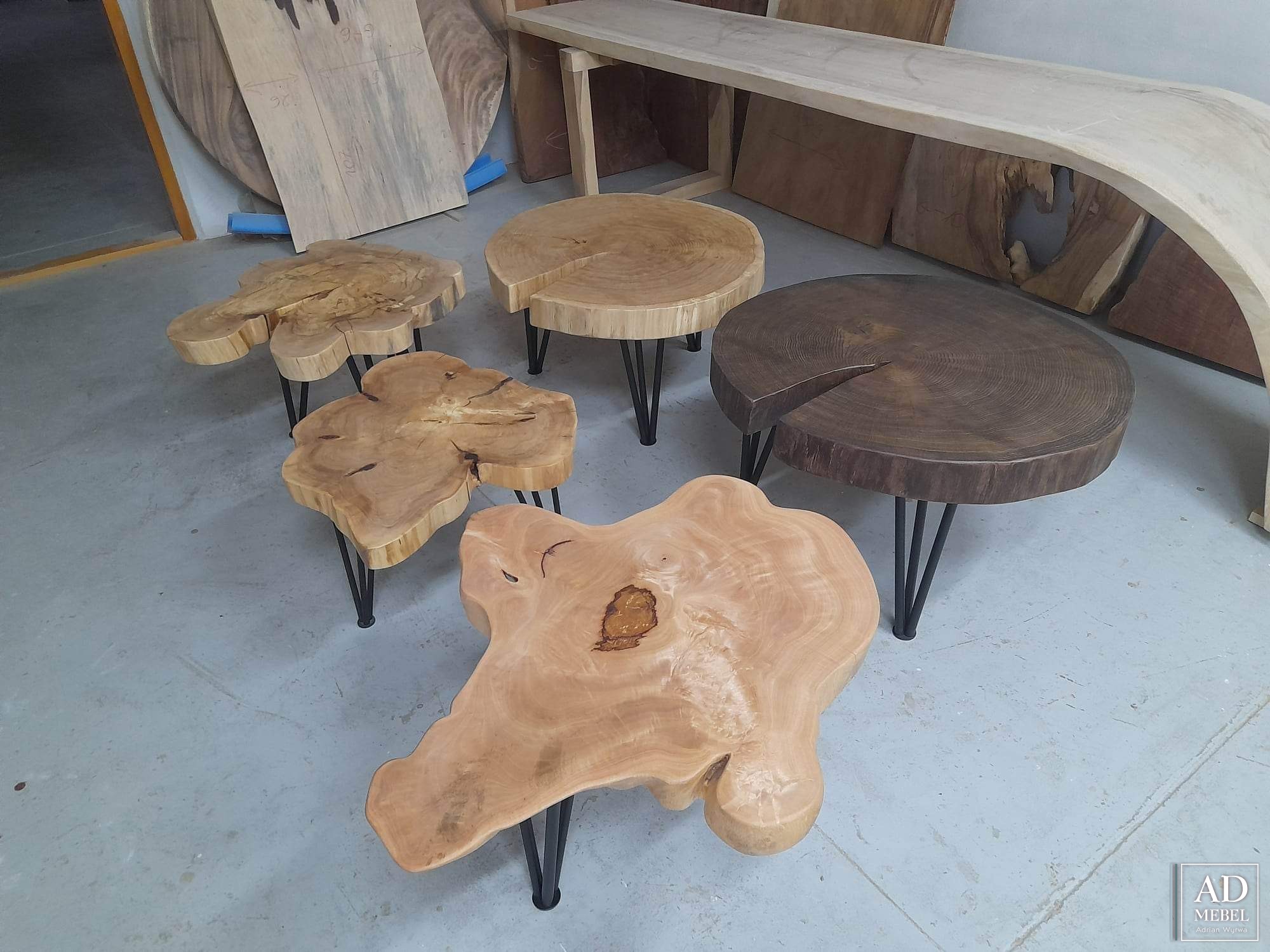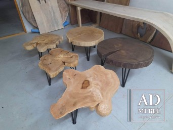 Na sprzedaż stolik kawowy z drewna wiązowego. Blat wykończony metodą olejowosku, nogi stalowe malowane na czarno metodą proszkową. Wymiary: średnica blaty 78-65 cm, wysokość stolika 45 cm, grubość blatu 7 cm.