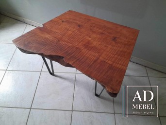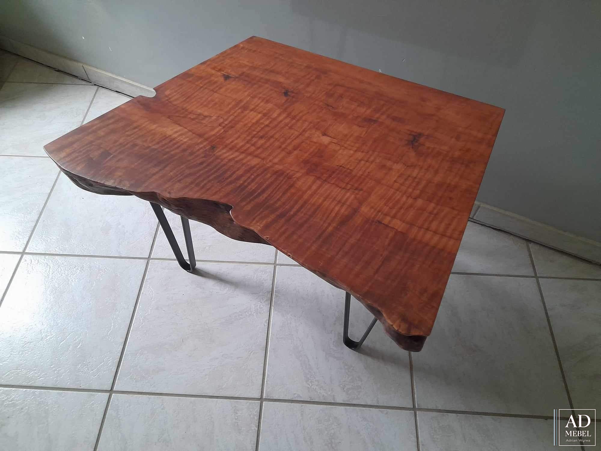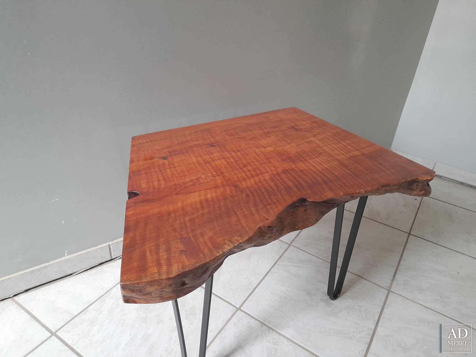 Stolik wykonany z połączenia drewna egzotycznego liczi oraz nogi wykonane z czarnej stali malowanej proszkowo. Powierzchnia blatu zabezpieczona żywicą oraz olejowoskiem.