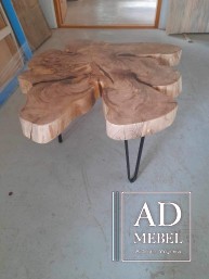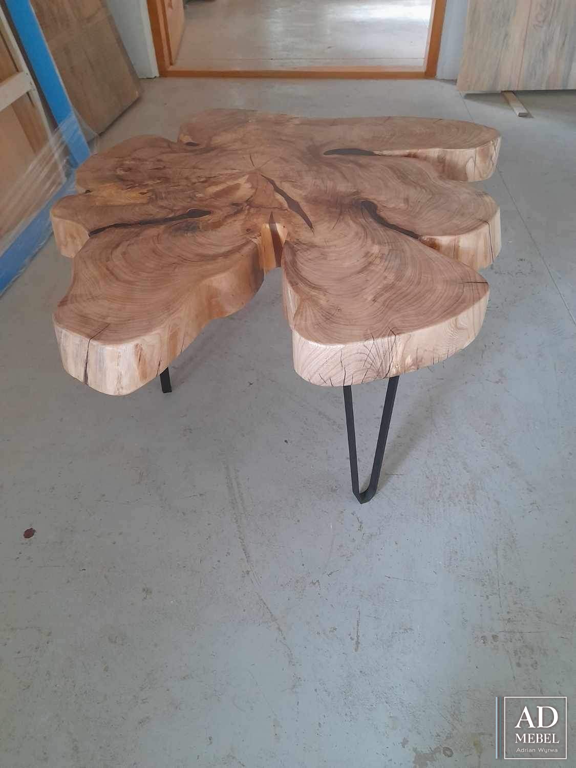 Piękny stolik kawowy - połączenie drewna wiązowego oraz stali malowanej proszkowo. Pięknie skomponuje się z każdym salonem. Wymiary to: 87-73 cm szerokość blatu, 7 cm grubość blatu, a wysokość stolika 47 cm. Zachęcamy do składania zapytań.