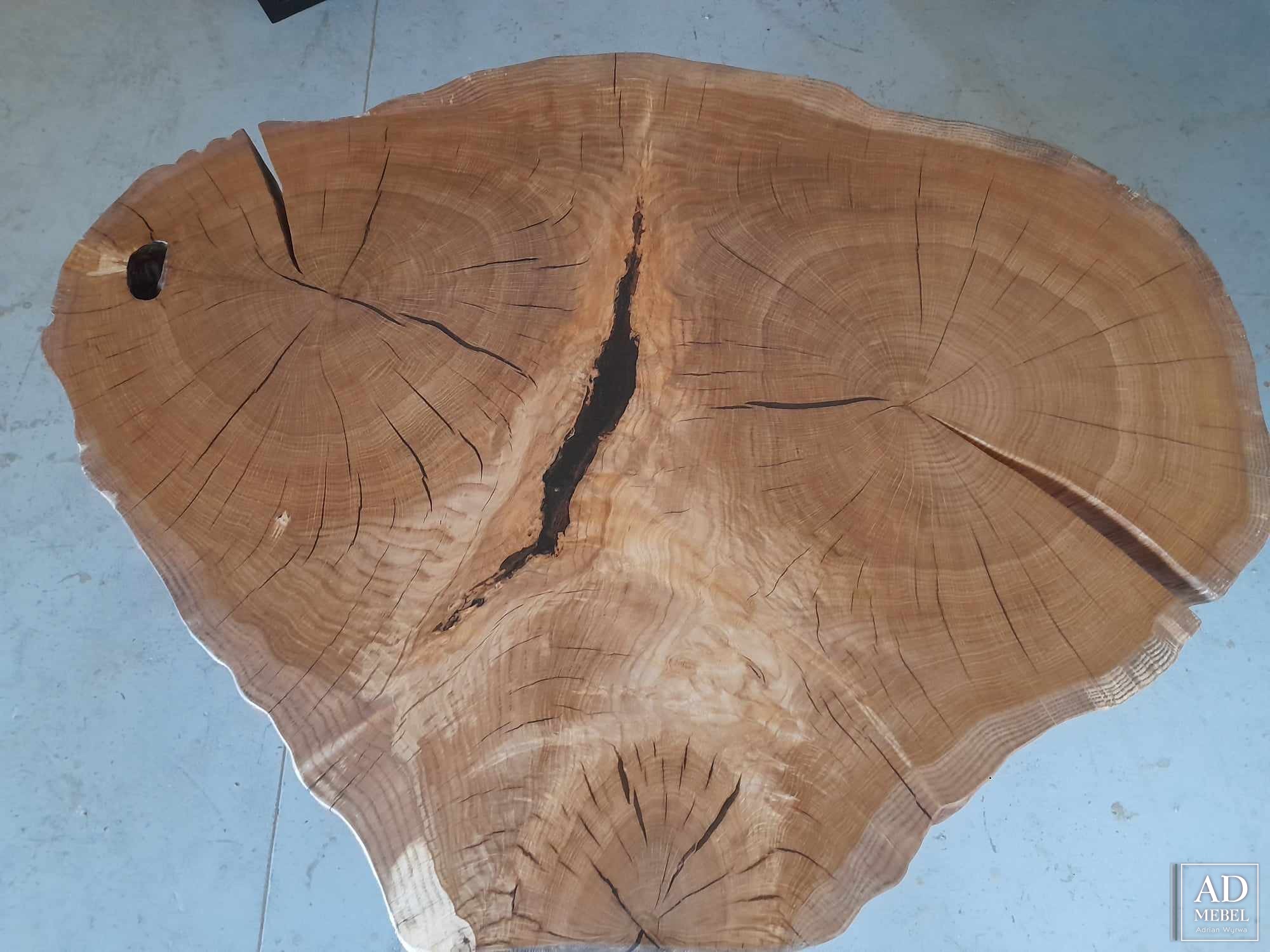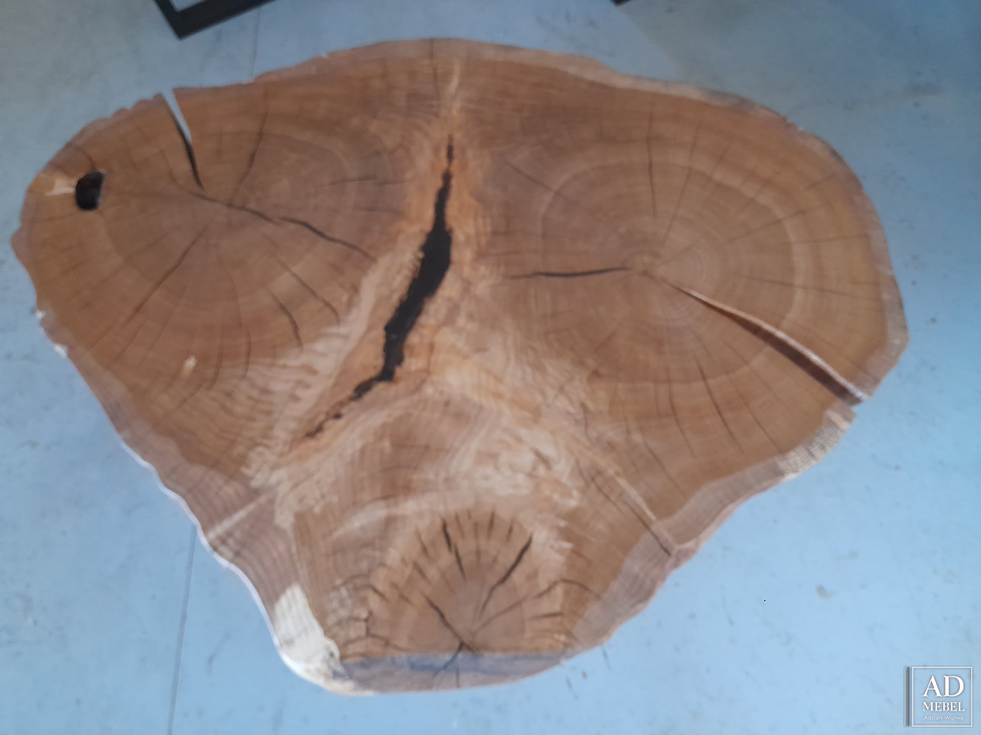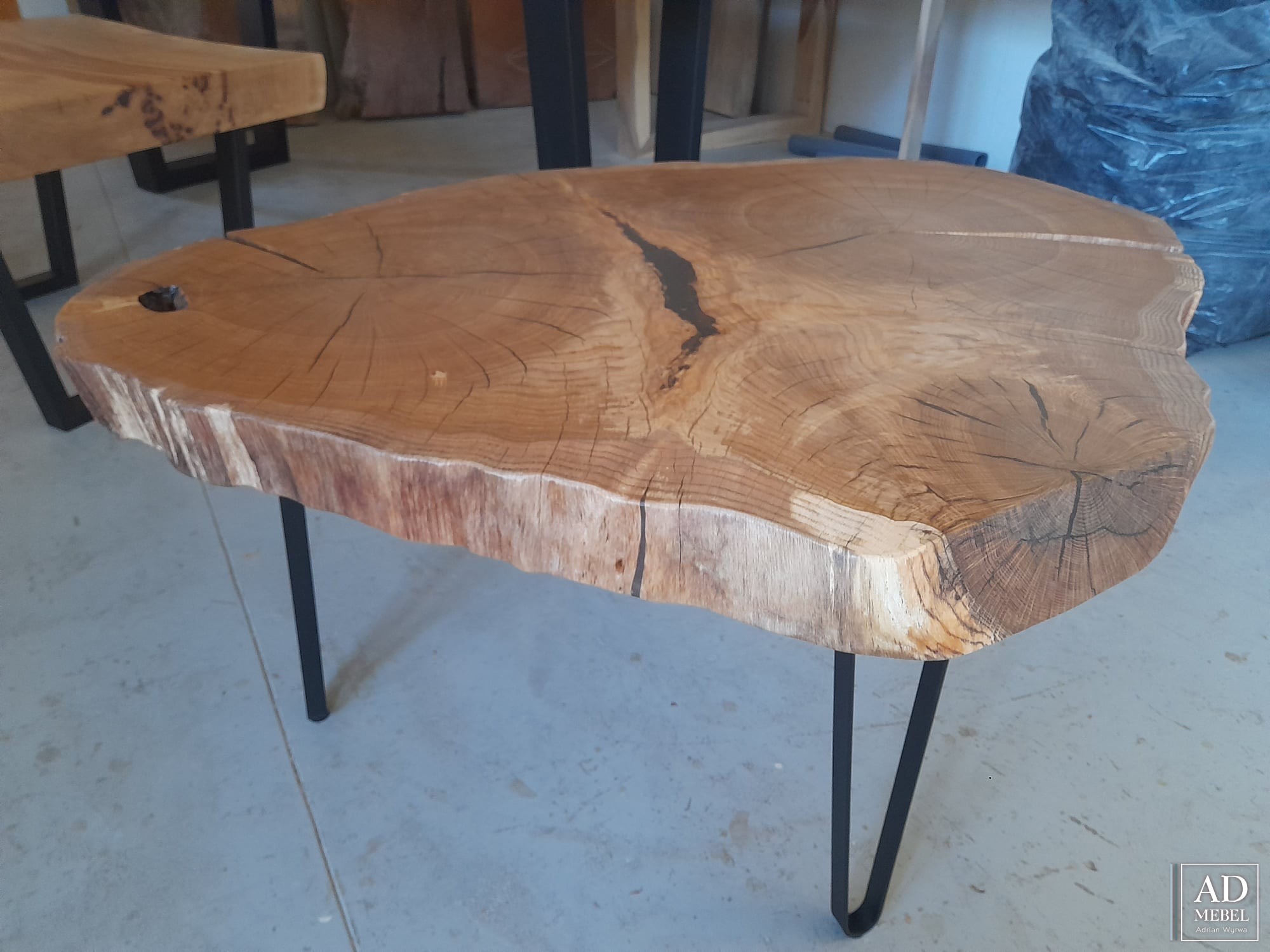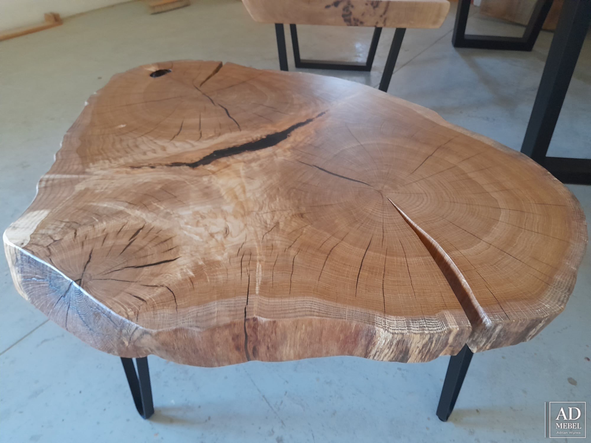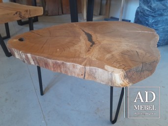 Na sprzedaż dostępny od ręki wyjątkowy stolik z drewna dębowego poprzecznie ciętego. Blat o nietypowym i bardzo wyrazistym usłojeniu został wykończony za pomocą najwyższej jakości izolantów, żywicy epoksydowej oraz olejowosku. Blat stolika o grubości 6,5 cm i średnicy 105x83 umocowany został na stalowych nogach malowanych proszkowo. Zapraszamy do kontaktu i zakupu tego wyjątkowego stolika!